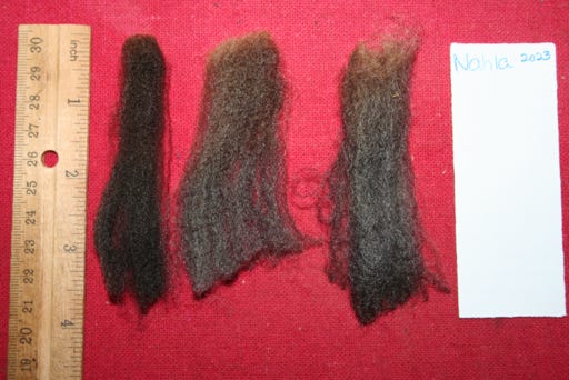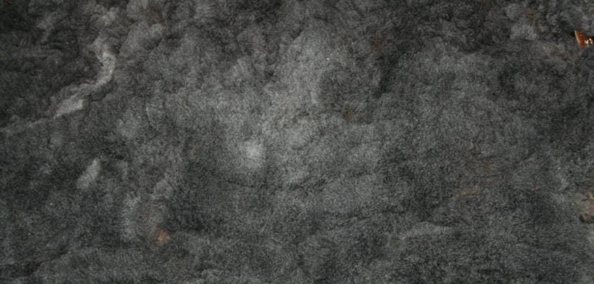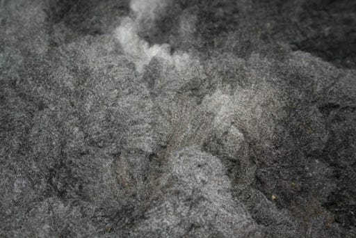 This fleece is dark gray to black heather in color with bulky locks. It is very soft, dense and springy. The crimp is often disorganized.