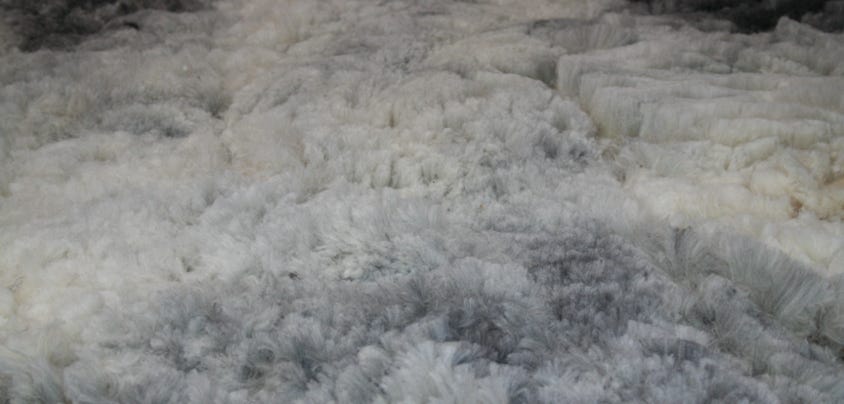 Mossie’s fleece is variegated light to medium gray.