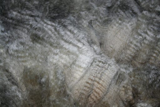 This lustrous fleece is fairly soft and silky with clear crimp, nice medium-sized locks and and a uniform staple length.