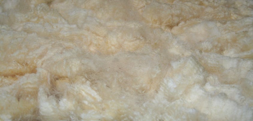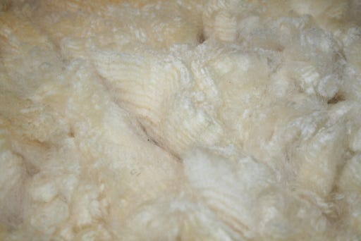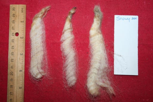 This all white fleece has shining luster. It is fairly soft and has nice, somewhat irregular crimp and good medium-sized locks.