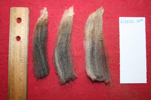 This is a super soft lambswool fleece. The locks are small to medium sized with clear, regular crimp. As with most lamb fleeces, it is somewhat tippy.