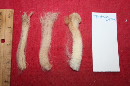 This is a very, very soft fleece. The locks are small at the shoulder, more bulky towards the rump. It has uniform staple length and the crimp is fine and clear.