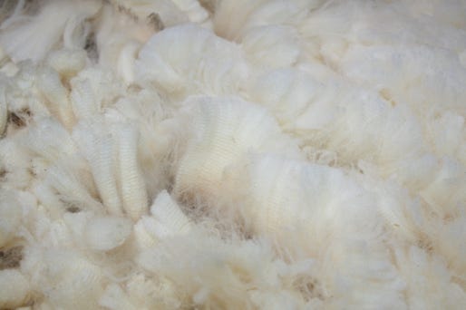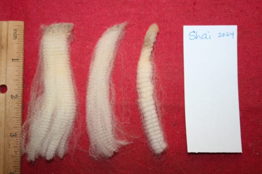 This fleece is a lovely white and very soft. It has nice, medium locks and clear, regular crimp. Both crimp and staple length are uniform across the fleece.
