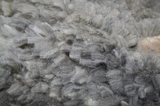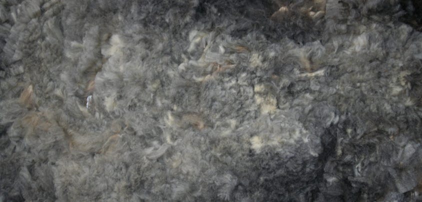 This is a super soft lamb fleece. It is variegated light gray with mottling. It has medium-sized locks and clear, regular crimp.