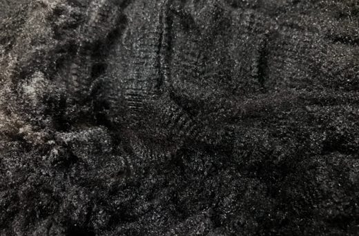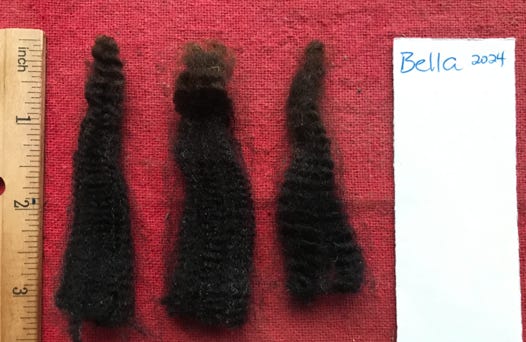 This fleece is very soft and uniform. The medium-sized locks are black with dark brown tips. The crimp is clear and regular.